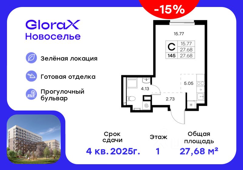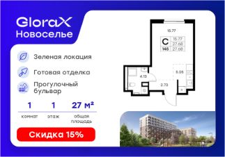 Продается квартира-студия на 1-м этаже в строящемся проекте комфорт-класса GloraX Новоселье. Общая площадь лота составляет 27,68 кв. м, из которых 15,77 кв. м отведено под жилую и 5,05 кв. м под кухонную зону. Номер квартиры - 145