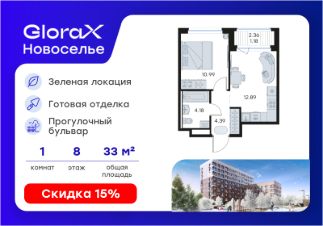 Продается 1-комн. квартира на 8-м этаже в строящемся проекте комфорт-класса GloraX Новоселье. Общая площадь лота составляет 33,63 кв. м, из которых 10,99 кв. м отведено под жилую и 12,89 кв. м под кухонную зону. Номер квартиры - 112