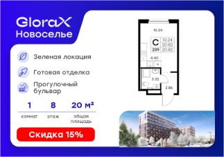 Продается квартира-студия на 8-м этаже в строящемся проекте комфорт-класса GloraX Новоселье. Общая площадь лота составляет 20,82 кв. м, из которых 10,24 кв. м отведено под жилую и 4,40 кв. м под кухонную зону. Номер квартиры - 239