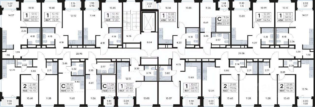 Продается 2-комн. квартира на 9-м этаже в строящемся проекте комфорт-класса Новоселье. Общая площадь лота составляет 46,43 кв. м, из которых 21,88 кв. м отведено под жилую и 12,74 кв. м под кухонную зону. Номер квартиры - 465