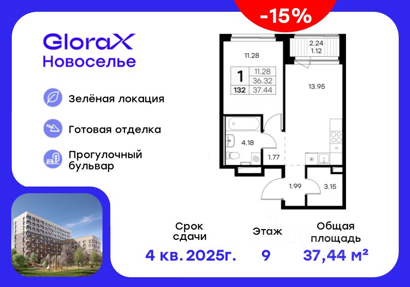 Продается 1-комн. квартира на 9-м этаже в строящемся проекте комфорт-класса GloraX Новоселье. Общая площадь лота составляет 37,44 кв. м, из которых 11,28 кв. м отведено под жилую и 13,95 кв. м под кухонную зону. Номер квартиры - 132