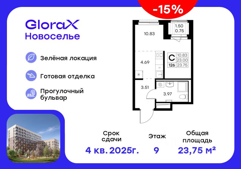 Продается квартира-студия на 9-м этаже в строящемся проекте комфорт-класса GloraX Новоселье. Общая площадь лота составляет 23,75 кв. м, из которых 10,83 кв. м отведено под жилую и 4,69 кв. м под кухонную зону. Номер квартиры - 126