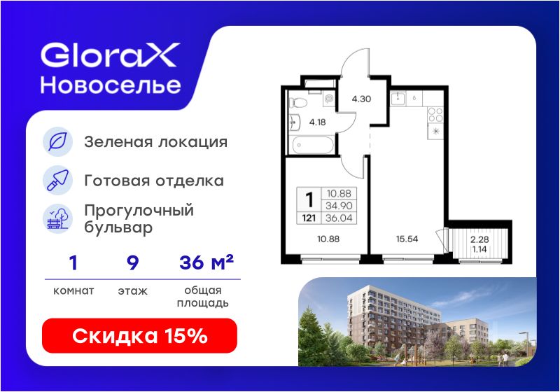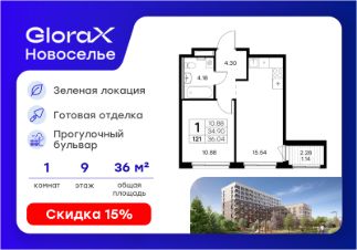 Продается 1-комн. квартира на 9-м этаже в строящемся проекте комфорт-класса GloraX Новоселье. Общая площадь лота составляет 36,04 кв. м, из которых 10,88 кв. м отведено под жилую и 15,54 кв. м под кухонную зону. Номер квартиры - 121