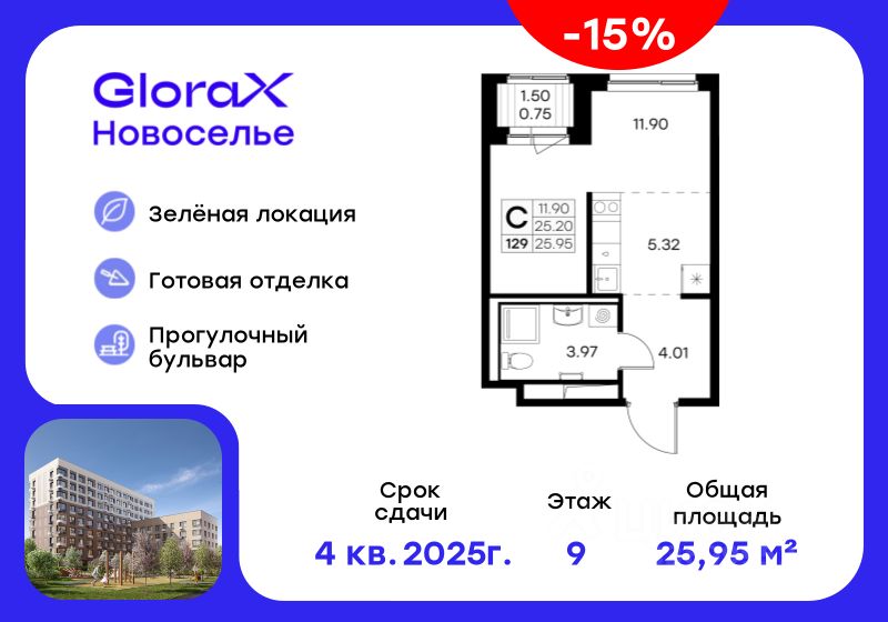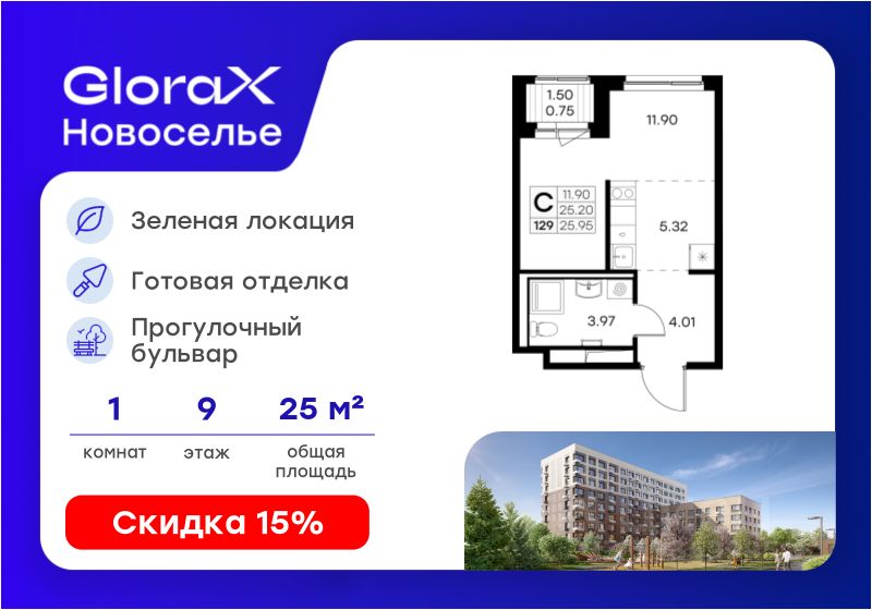 Продается квартира-студия на 9-м этаже в строящемся проекте комфорт-класса GloraX Новоселье. Общая площадь лота составляет 25,95 кв. м, из которых 11,90 кв. м отведено под жилую и 5,32 кв. м под кухонную зону. Номер квартиры - 129