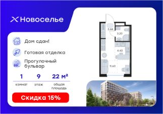 Продается квартира-студия на 9-м этаже в строящемся проекте комфорт-класса Новоселье. Общая площадь лота составляет 22,64 кв. м, из которых 11,60 кв. м отведено под жилую и 4,40 кв. м под кухонную зону. Номер квартиры - 247