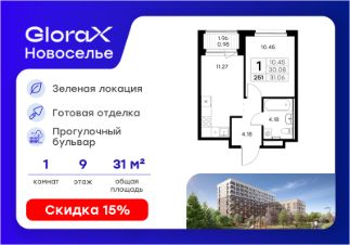 Продается 1-комн. квартира на 9-м этаже в строящемся проекте комфорт-класса GloraX Новоселье. Общая площадь лота составляет 31,06 кв. м, из которых 10,45 кв. м отведено под жилую и 11,27 кв. м под кухонную зону. Номер квартиры - 251