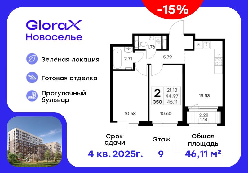 Продается 2-комн. квартира на 9-м этаже в строящемся проекте комфорт-класса GloraX Новоселье. Общая площадь лота составляет 46,11 кв. м, из которых 21,18 кв. м отведено под жилую и 13,53 кв. м под кухонную зону. Номер квартиры - 350