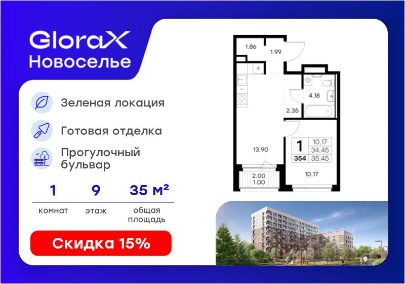 Продается 1-комн. квартира на 9-м этаже в строящемся проекте комфорт-класса GloraX Новоселье. Общая площадь лота составляет 35,45 кв. м, из которых 10,17 кв. м отведено под жилую и 13,90 кв. м под кухонную зону. Номер квартиры - 354