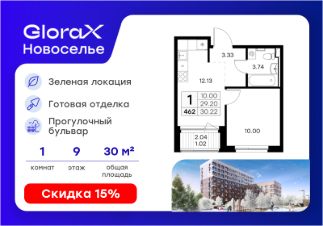 Продается 1-комн. квартира на 9-м этаже в строящемся проекте комфорт-класса GloraX Новоселье. Общая площадь лота составляет 30,22 кв. м, из которых 10,00 кв. м отведено под жилую и 12,13 кв. м под кухонную зону. Номер квартиры - 462