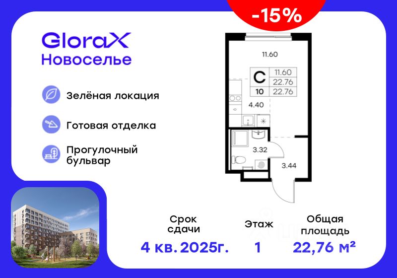 Продается квартира-студия на 1-м этаже в строящемся проекте комфорт-класса GloraX Новоселье. Общая площадь лота составляет 22,76 кв. м, из которых 11,60 кв. м отведено под жилую и 4,40 кв. м под кухонную зону. Номер квартиры - 10