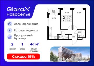 Продается 2-комн. квартира на 1-м этаже в строящемся проекте комфорт-класса GloraX Новоселье. Общая площадь лота составляет 46,60 кв. м, из которых 21,88 кв. м отведено под жилую и 12,74 кв. м под кухонную зону. Номер квартиры - 5