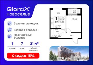 Продается 1-комн. квартира на 7-м этаже в строящемся проекте комфорт-класса GloraX Новоселье. Общая площадь лота составляет 31,25 кв. м, из которых 10,05 кв. м отведено под жилую и 11,35 кв. м под кухонную зону. Номер квартиры - 219
