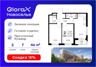 Продается 2-комн. квартира на 7-м этаже в строящемся проекте комфорт-класса GloraX Новоселье. Общая площадь лота составляет 46,55 кв. м, из которых 21,88 кв. м отведено под жилую и 12,74 кв. м под кухонную зону. Номер квартиры - 358