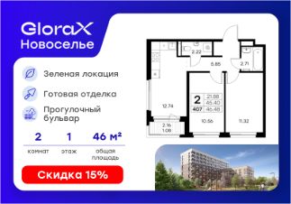 Продается 2-комн. квартира на 1-м этаже в строящемся проекте комфорт-класса GloraX Новоселье. Общая площадь лота составляет 46,48 кв. м, из которых 21,88 кв. м отведено под жилую и 12,74 кв. м под кухонную зону. Номер квартиры - 407