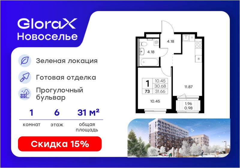 Продается 1-комн. квартира на 6-м этаже в строящемся проекте комфорт-класса GloraX Новоселье. Общая площадь лота составляет 31,66 кв. м, из которых 10,45 кв. м отведено под жилую и 11,87 кв. м под кухонную зону. Номер квартиры - 73
