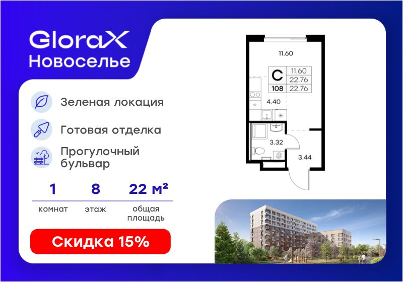 Продается квартира-студия на 8-м этаже в строящемся проекте комфорт-класса GloraX Новоселье. Общая площадь лота составляет 22,76 кв. м, из которых 11,60 кв. м отведено под жилую и 4,40 кв. м под кухонную зону. Номер квартиры - 108