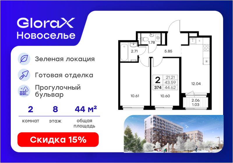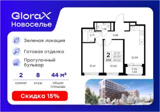Продается 2-комн. квартира на 8-м этаже в строящемся проекте комфорт-класса GloraX Новоселье. Общая площадь лота составляет 44,62 кв. м, из которых 21,21 кв. м отведено под жилую и 12,04 кв. м под кухонную зону. Номер квартиры - 374
