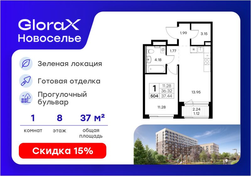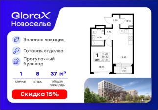 Продается 1-комн. квартира на 8-м этаже в строящемся проекте комфорт-класса GloraX Новоселье. Общая площадь лота составляет 37,44 кв. м, из которых 11,28 кв. м отведено под жилую и 13,95 кв. м под кухонную зону. Номер квартиры - 504