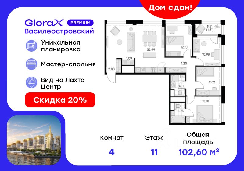 Продается 4-комн. квартира на 11-м этаже в сданном проекте премиум-класса GloraX Premium Василеостровский. Общая площадь лота составляет 101,80 кв. м, из которых 45,94 кв. м отведено под жилую и 32,99 кв. м под кухонную зону. Номер квартиры - 36