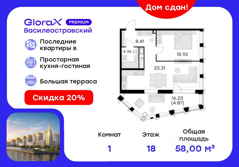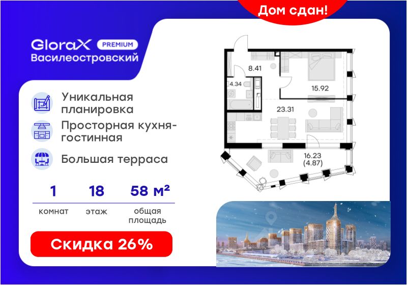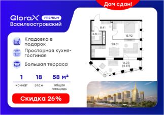 Продается 1-комн. квартира на 18-м этаже в сданном проекте премиум-класса GloraX Premium Василеостровский. Общая площадь лота составляет 56,85 кв. м, из которых 15,92 кв. м отведено под жилую и 23,31 кв. м под кухонную зону. Номер квартиры - 567