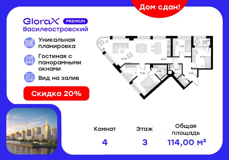 Продается 4-комн. квартира на 3-м этаже в сданном проекте премиум-класса GloraX Premium Василеостровский. Общая площадь лота составляет 114,06 кв. м, из которых 65,69 кв. м отведено под жилую и 25,97 кв. м под кухонную зону. Номер квартиры - 3