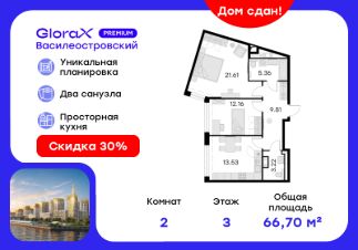 Продается 2-комн. квартира на 3-м этаже в сданном проекте премиум-класса GloraX Premium Василеостровский. Общая площадь лота составляет 65,69 кв. м, из которых 33,77 кв. м отведено под жилую и 13,53 кв. м под кухонную зону. Номер квартиры - 628