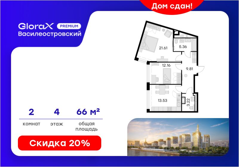 Продается 2-комн. квартира на 4-м этаже в сданном проекте премиум-класса GloraX Premium Василеостровский. Общая площадь лота составляет 65,69 кв. м, из которых 33,77 кв. м отведено под жилую и 13,53 кв. м под кухонную зону. Номер квартиры - 634