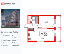 Удобная, классическая, функциональная европланировка, большая кухня-гостиная 18.26 м², вместительная прихожая 3.58 м². Общая площадь квартиры - 37.04 м², жилая 11.76 м², высота потолка 2.77 м.