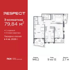 Трехкомнатная квартира от застройщика с отделкой в ЖК "RESPECT" на 9 этаже. Общая площадь: 79.84 кв.м., жилая: 44.24 кв.м., площадь просторной кухни-столовой: 16.03 кв.м. Угловая квартира, очень светлая, естественная вентиляция при открытии окон. В квартире один балкон и две лоджии, один совмещенный и один раздельный санузел. Высота потолков 2.7 м. В ЖК Respect представлены два варианта чистовой отделки: светлая и тёмная. Потолки: натяжные или выравнивание с окраской, Окна: из ПВХ профиля с двухкамерным стеклопакетом, Остекление балконов и лоджий: алюминиевое однослойное, Полы: покрытие из ламината, полы санузлов: керамическая плитка или керамогранит, Стены: обои под окраску, стены санузлов: керамическая плитка или керамогранит. Установлены межкомнатные двери. Санузел: раковина с тумбой, ванна или душевая кабина, унитаз, смесители. Выполнена полная разводка электропроводки. Квартира находится в корпусе 6. Дом монолитный, одноподъездный, высотой 13 этажей. На этаже 8 квартир. В подъезде 1 пассажирский и 1 грузовой лифт. Окончание строительства - 4 квартал 2026 года. Оформление сделки по договору долевого участия. В шаговой доступности от жилого комплекса расположены станции метро (расстояние по прямой): "Лесная" (800 м), "Площадь Мужества" (1.4 км), "Выборгская" (1.9 км), также недалеко от этого корпуса находятся станции метро: "Академическая", "Политехническая". Квартал строится на Полюстровском пр, 87, в одной из самых востребованных локаций Петербурга. В 10 минутах пешком - метро "Лесная" и в 10 минутах на транспорте - Петроградская сторона. Высота домов от 7 до 13 этажей. На территории Respect строится школа на 1125 учащихся и детский сад на 240 мест. Запроектированы собственная газовая котельная, закрытая территория, дворы без машин и подземные паркинги с лифтами. Вентилируемые фасады облицованы клинкерным кирпичом. Дома из этого материала служат веками, являясь гордостью хозяев. Дизайн парадных зон и входных групп - сочетание лаконичности отделки и декоративных элементов с текстурами из натурального камня и дерева с приглушенной подсветкой теплым светом. Во входных группах расположены гостевые зоны с мягкой мебелью. Вся территория квартала будет связана единой концепцией благоустройства, разработанной ландшафтным бюро L.BURO. В основе - идея создания увлекательного ландшафтного пространства для насыщенной жизни, включающего в себя пейзажные зоны, современные архитектурные композиции, открытые террасы на стилобатах с зонами отдыха и парклетами, спортивными площадками. Это пространство для людей всех возрастов и различных увлечений. На эксплуатируемой кровле на уровне первого этажа в домах 1 и 4 будут обустроены общественные видовые террасы. В квартале запроектированы внутренние закрытые территории дворов домов без доступа автомобилей и безбарьерная среда для велосипедистов и колясок. Предусмотрены IP-домофония с функцией дистанционного открывания калиток и парадных, а также дистанционный сбор показаний счетчиков и