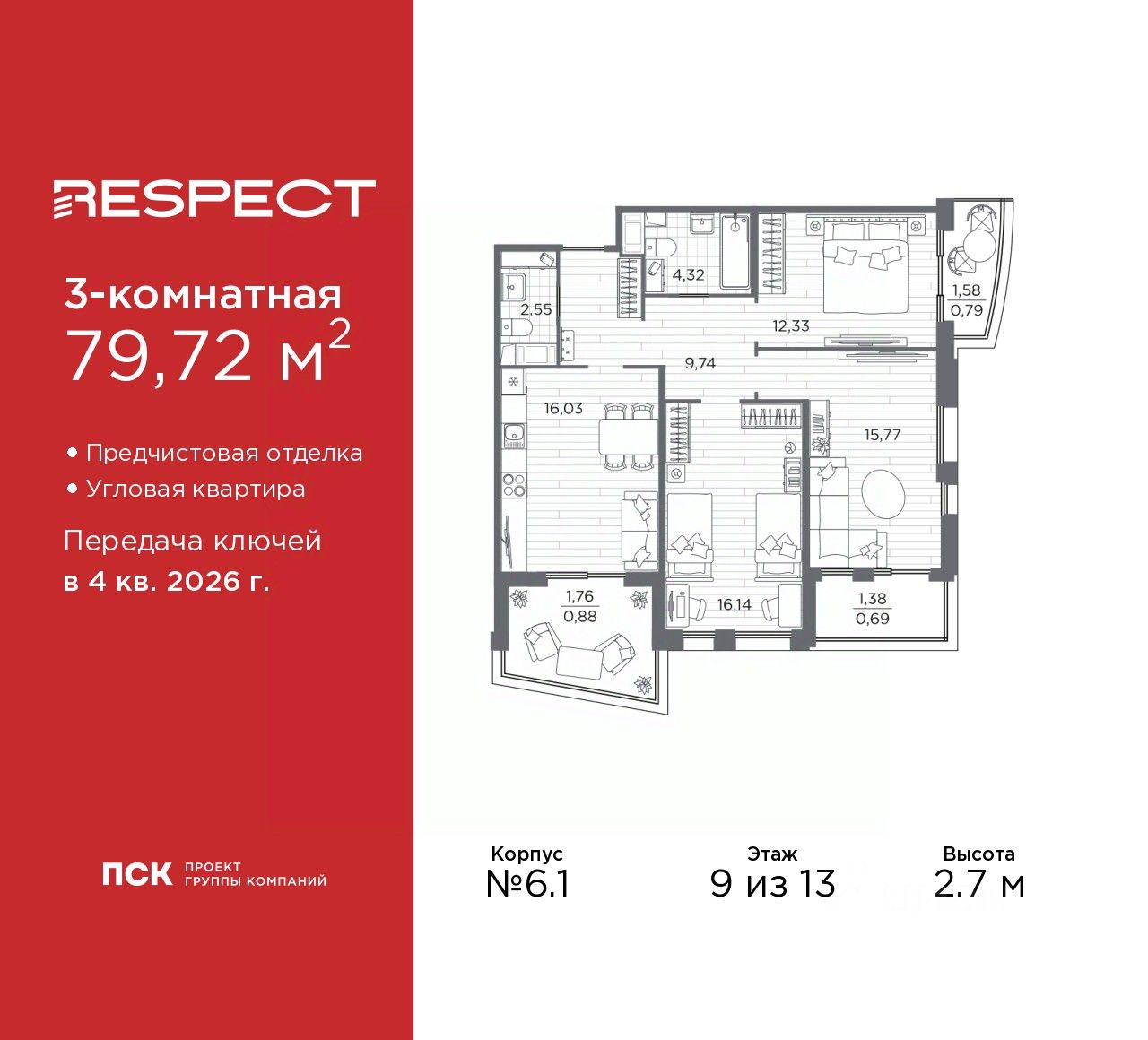 3-комн. квартира с предчистовой отделкой в ЖК "RESPECT" на 9 этаже. Общая площадь: 79.72 кв.м., жилая: 44.24 кв.м., площадь просторной кухни-столовой: 16.03 кв.м. Квартира угловая, окна oбecпeчивaют paвнoмepнoe ocвeщeниe в тeчeниe дня. В квартире один балкон и две лоджии, один совмещенный и один раздельный санузел. Высота потолков 2.7 м.