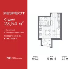 Просторная однокомнатная квартира-студия с отделкой в ЖК "RESPECT" на 13 этаже. Общая площадь: 23.54 кв.м., площадь гостиной 15.36 кв.м., из которых 5 кв.м. выделено под кухонную зону. Все окна выходят на одну сторону. В квартире один балкон, один совмещенный санузел. Высота потолков 2.7 м.
