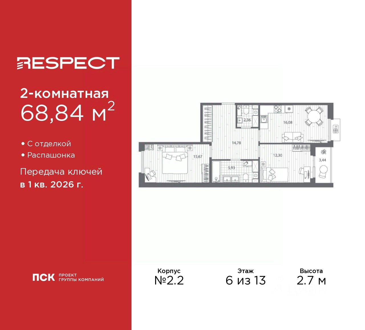 Просторная 2-комн. квартира с отделкой в ЖК "RESPECT" на 6 этаже. Общая площадь: 68.84 кв.м., жилая: 27.97 кв.м., площадь просторной кухни-столовой: 16.08 кв.м. Квартира - распашонка, без проходных комнат, окна выходят на paзные стороны дома. В квартире одна лоджия, один совмещенный и один раздельный санузел. Высота потолков 2.7 м.