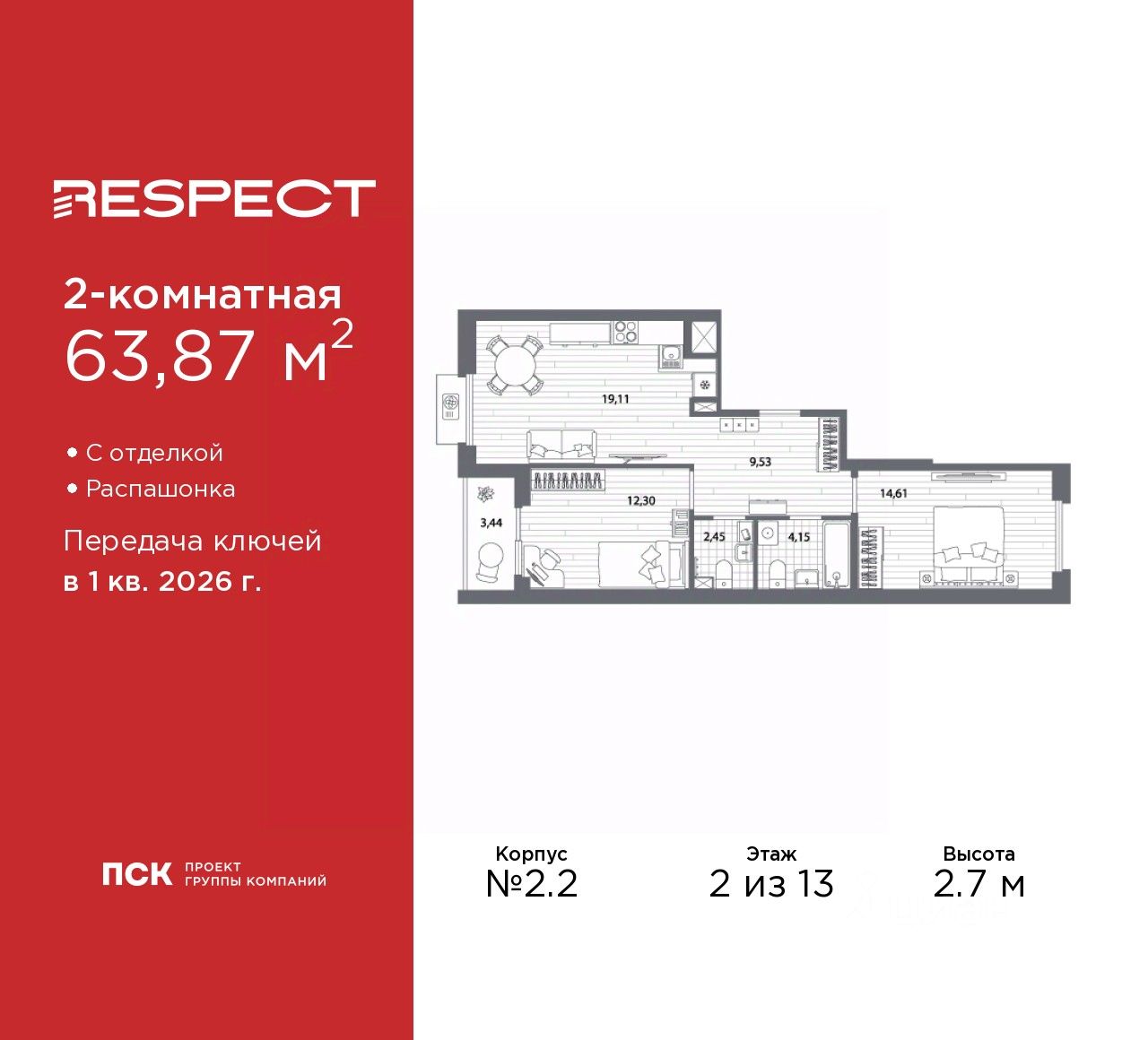 2-комн. квартира от застройщика с отделкой в ЖК "RESPECT" на 2 этаже. Общая площадь: 63.87 кв.м., жилая: 26.91 кв.м., площадь просторной кухни-столовой: 19.11 кв.м. Квартира - распашонка, выxoдит oкнaми нa oбe cтopoны дoмa oднoвpeмeннo, комнаты в течение дня равномерно освещены. В квартире одна лоджия, один совмещенный и один раздельный санузел. Высота потолков 2.7 м.