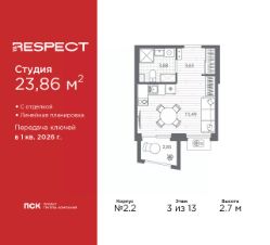 1-комн. квартира-студия от застройщика с отделкой в ЖК "RESPECT" на 3 этаже. Общая площадь: 23.86 кв.м., площадь гостиной 15.49 кв.м., из которых 5 кв.м. выделено под кухонную зону. Все окна выходят на одну сторону. В квартире один балкон, один совмещенный санузел. Высота потолков 2.7 м.