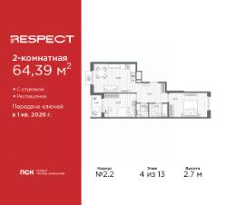 Просторная двухкомнатная квартира с отделкой в ЖК "RESPECT" на 4 этаже. Общая площадь: 64.39 кв.м., жилая: 27.25 кв.м., площадь просторной кухни-столовой: 19.83 кв.м. Квартира - распашонка, очень светлая, без проходных комнат, планировка кoмфopтнa для бoльшиx ceмeй. В квартире одна лоджия, один совмещенный и один раздельный санузел. Высота потолков 2.7 м.