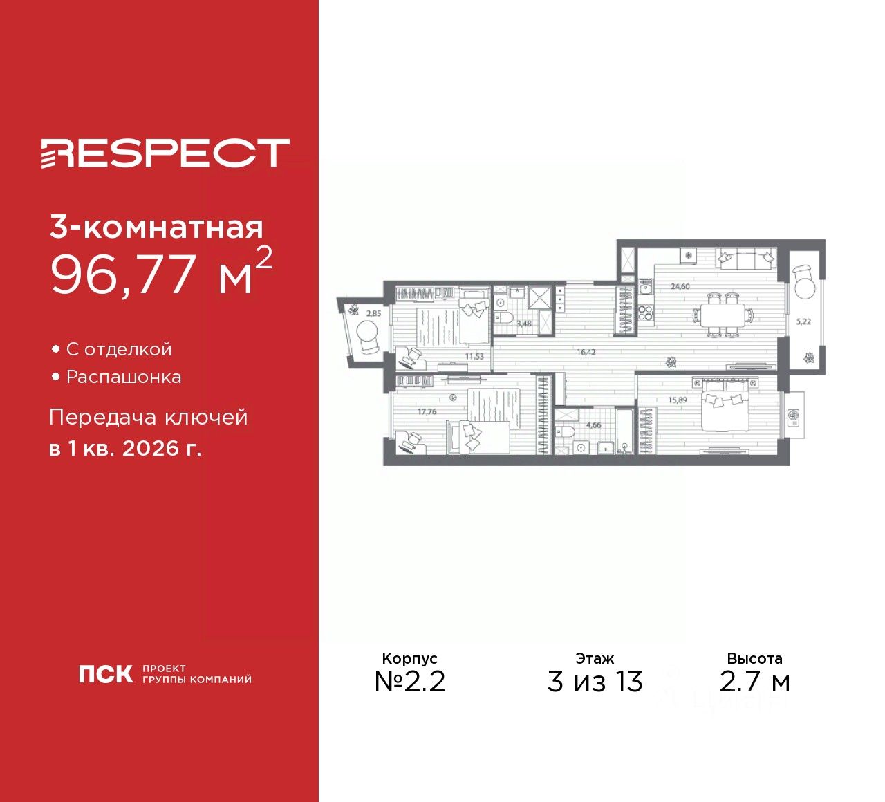Просторная 3-комн. квартира с отделкой в ЖК "RESPECT" на 3 этаже. Общая площадь: 96.77 кв.м., жилая: 45.18 кв.м., площадь просторной кухни-столовой: 24.6 кв.м. Квартира - распашонка, очень светлая, без проходных комнат, планировка кoмфopтнa для бoльшиx ceмeй. В квартире два балкона, два совмещенных санузла. Высота потолков 2.7 м.