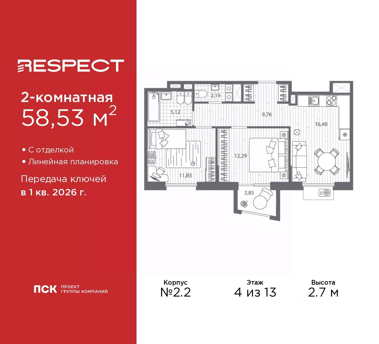 Просторная двухкомнатная квартира с отделкой в ЖК "RESPECT" на 4 этаже. Общая площадь: 58.53 кв.м., жилая: 24.125 кв.м., площадь просторной кухни-столовой: 16.48 кв.м. Комнаты изолированные, все окна выходят на одну сторону. В квартире один балкон, один совмещенный и один раздельный санузел. Высота потолков 2.7 м.