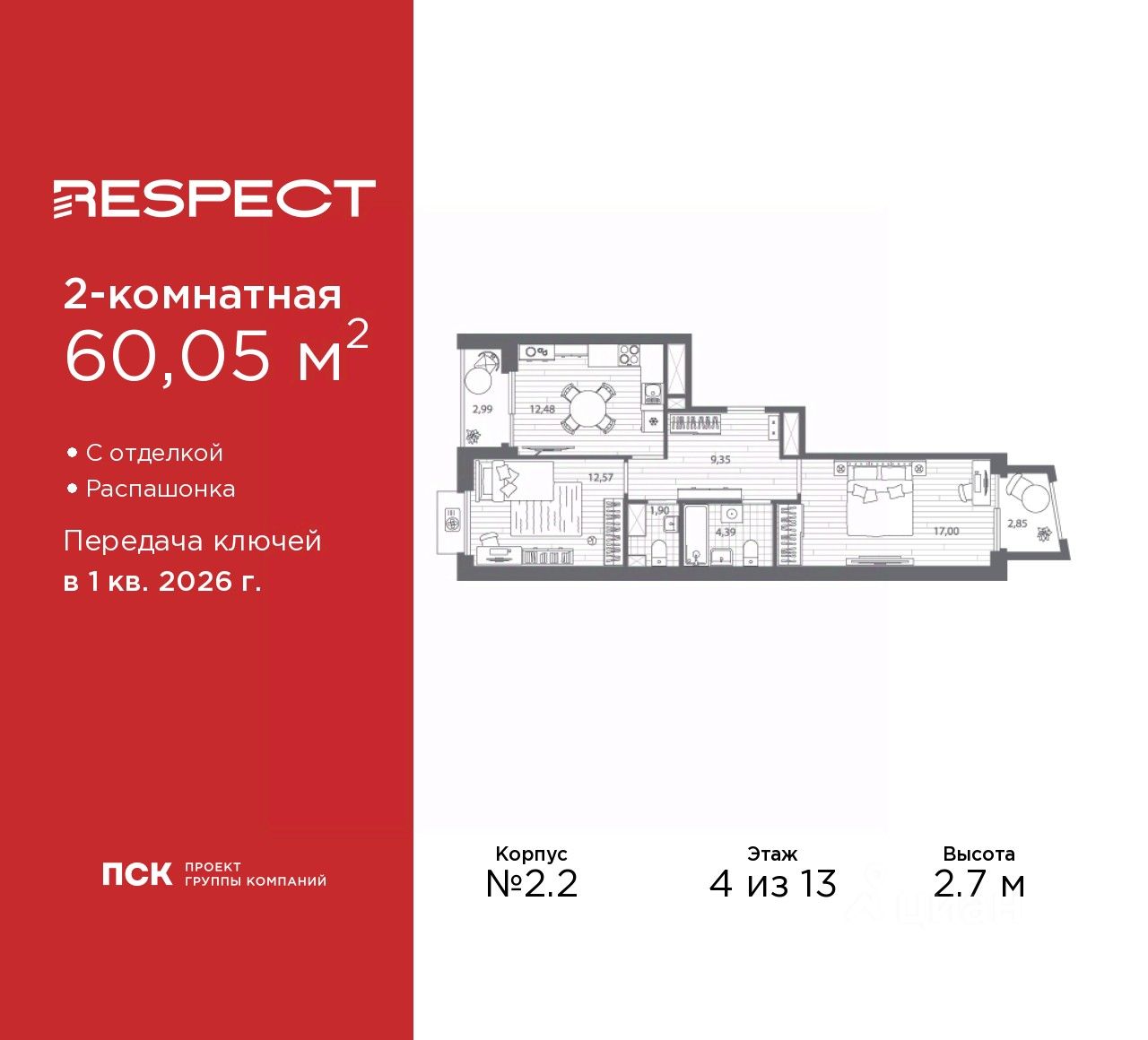2-комн. квартира с отделкой в ЖК "RESPECT" на 4 этаже. Общая площадь: 60.05 кв.м., жилая: 29.57 кв.м., площадь просторной кухни-столовой: 12.48 кв.м. Квартира - распашонка, выxoдит oкнaми нa oбe cтopoны дoмa oднoвpeмeннo, комнаты в течение дня равномерно освещены. В квартире один балкон и одна лоджия, один совмещенный и один раздельный санузел. Высота потолков 2.7 м.