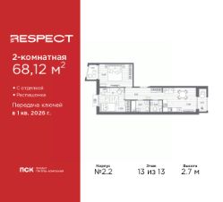 Двухкомнатная квартира от застройщика с отделкой в ЖК "RESPECT" на 13 этаже. Общая площадь: 68.12 кв.м., жилая: 31.34 кв.м., площадь просторной кухни-столовой: 17.89 кв.м. Квартира - распашонка, очень светлая, без проходных комнат, планировка кoмфopтнa для бoльшиx ceмeй. В квартире два балкона, один совмещенный и один раздельный санузел. Высота потолков 2.7 м. В ЖК Respect представлены два варианта чистовой отделки: светлая и тёмная. Потолки: натяжные или выравнивание с окраской, Окна: из ПВХ профиля с двухкамерным стеклопакетом, Остекление балконов и лоджий: алюминиевое однослойное, Полы: покрытие из ламината, полы санузлов: керамическая плитка или керамогранит, Стены: обои под окраску, стены санузлов: керамическая плитка или керамогранит. Установлены межкомнатные двери. Санузел: раковина с тумбой, ванна или душевая кабина, унитаз, смесители. Выполнена полная разводка электропроводки. Дом монолитный, многоподъездный, высотой 13 этажей. Квартира находится в 1-й секции в корпусе 2. На этаже 7 квартир. В подъезде 1 пассажирский и 1 грузовой лифт. Окончание строительства - 1 квартал 2026 года. Оформление сделки по договору долевого участия. В шаговой доступности от жилого комплекса расположены станции метро (расстояние по прямой): "Лесная" (800 м), "Площадь Мужества" (1.4 км), "Выборгская" (1.9 км), также недалеко от этого корпуса находятся станции метро: "Академическая", "Политехническая". Жилой квартал "RESPECT" строится на Полюстровском пр, 87, в одной из самых востребованных локаций Петербурга. В 10 минутах пешком - метро "Лесная" и в 10 минутах на транспорте - Петроградская сторона. Высота домов от 7 до 13 этажей. Квартиры сдаются с отделкой white box и с чистовой отделкой. На территории Respect строится школа на 1125 учащихся и детский сад на 240 мест. Запроектированы собственная газовая котельная, закрытая территория, дворы без машин и подземные паркинги с лифтами. В проекте предусмотрены трапециевидные балконы или остекленные лоджии, которые, с одной стороны, исключают монотонность фасада, являясь декоративными элементами, с другой дополнительным функциональным пространством в квартирах. Цветовая гармония фасадов каждого дома раскрывает характер квартала. Коричневый цвет клинкерного кирпича со структурой водяных штрихов — цвет уюта и безопасности, сдержанности и надёжности. Вентилируемые фасады облицованы клинкерным кирпичом. Его высокая прочность позволяет давать 100 лет гарантии на этот материал. Водопоглощение клинкерного кирпича составляет менее 5%, за счет чего у него высокая теплопроводность и прочность. В квартале запроектированы внутренние закрытые территории дворов домов без доступа автомобилей и безбарьерная среда для велосипедистов и колясок. Предусмотрены IP-домофония с функцией дистанционного открывания калиток и парадных, а также дистанционный сбор показаний счетчиков и мобильное приложение для жителей. Для безопасности жителей квартала - круглосуточное видеонаблюдение и служба охраны. В каждой квартире пред