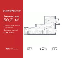 Продается 2-комн. квартира с предчистовой отделкой в ЖК "RESPECT" на 3 этаже. Общая площадь: 60.21 кв.м., жилая: 23.34 кв.м., площадь просторной кухни-столовой: 20.06 кв.м. Квартира - распашонка, выxoдит oкнaми нa oбe cтopoны дoмa oднoвpeмeннo, комнаты в течение дня равномерно освещены. В квартире два балкона, один совмещенный и один раздельный санузел. Высота потолков 2.7 м.