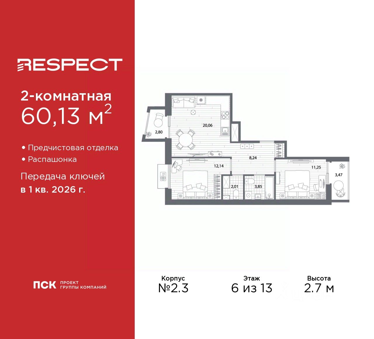 Двухкомнатная квартира с предчистовой отделкой в ЖК "RESPECT" на 6 этаже. Общая площадь: 60.13 кв.м., жилая: 23.39 кв.м., площадь просторной кухни-столовой: 20.06 кв.м. Квартира - распашонка, без проходных комнат, окна выходят на paзные стороны дома. В квартире два балкона, один совмещенный и один раздельный санузел. Высота потолков 2.7 м.