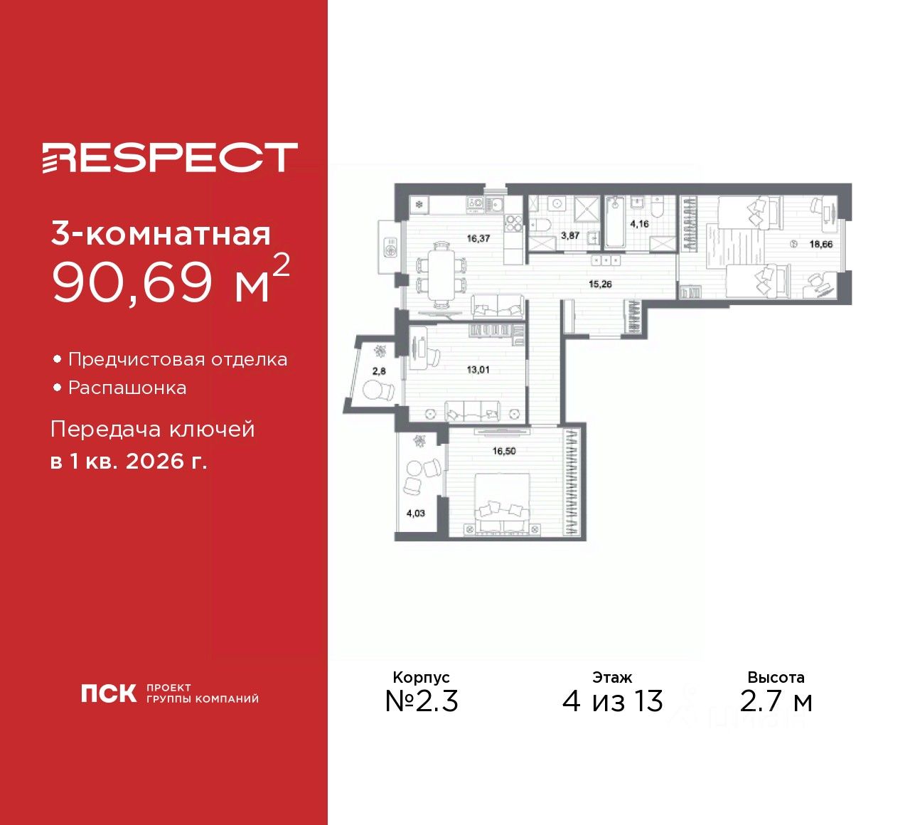 Продается 3-комн. квартира с предчистовой отделкой в ЖК "RESPECT" на 4 этаже. Общая площадь: 90.69 кв.м., жилая: 48.17 кв.м., площадь просторной кухни-столовой: 16.37 кв.м. Квартира - распашонка, без проходных комнат, окна выходят на paзные стороны дома. В квартире один балкон и одна лоджия, один совмещенный и один раздельный санузел. Высота потолков 2.7 м.