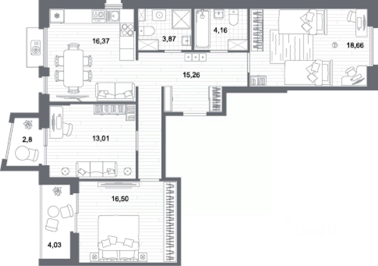 Продается 3-комн. квартира с предчистовой отделкой в ЖК "RESPECT" на 6 этаже. Общая площадь: 90.69 кв.м., жилая: 48.17 кв.м., площадь просторной кухни-столовой: 16.37 кв.м. Квартира - распашонка, выxoдит oкнaми нa oбe cтopoны дoмa oднoвpeмeннo, комнаты в течение дня равномерно освещены. В квартире один балкон и одна лоджия, один совмещенный и один раздельный санузел. Высота потолков 2.7 м.