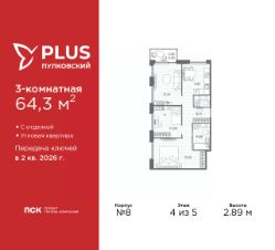 Продается 3-комн. квартира от застройщика с отделкой в ЖК "PLUS Пулковский" на 4 этаже. Общая площадь: 64.3 кв.м., жилая: 38.97 кв.м., площадь просторной кухни-столовой: 9.85 кв.м. Квартира угловая, идеально подойдет любителям тишины и панорамных видов. В квартире один балкон, один совмещенный и один раздельный санузел. Высота потолков 2.89 м.
