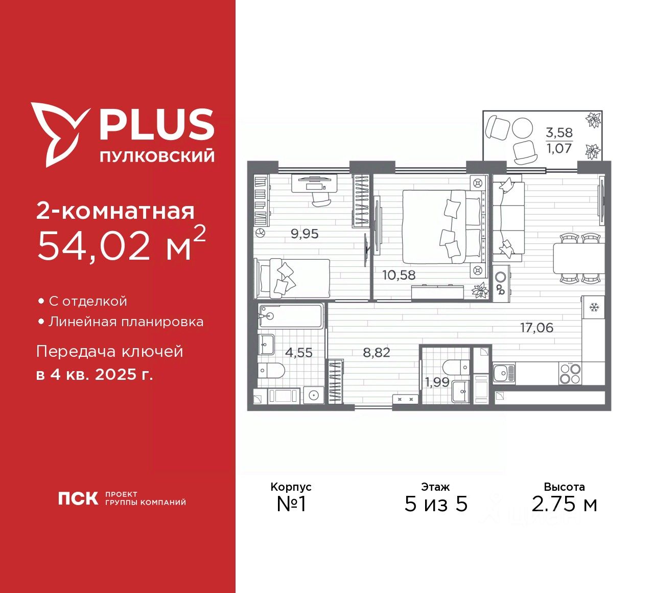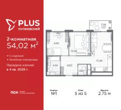 Двухкомнатная квартира с отделкой в ЖК "PLUS Пулковский" на 5 этаже. Общая площадь: 54.02 кв.м., жилая: 20.53 кв.м., площадь просторной кухни-столовой: 17.06 кв.м. Комнаты изолированные, все окна выходят на одну сторону. В квартире один балкон, один совмещенный и один раздельный санузел. Высота потолков 2.75 м.