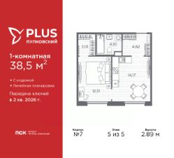 Однокомнатная квартира с отделкой в ЖК "PLUS Пулковский" на 5 этаже. Общая площадь: 38.5 кв.м., жилая: 12.51 кв.м., площадь просторной кухни-столовой: 14.17 кв.м. Все окна выходят на одну сторону. В квартире один совмещенный санузел. Высота потолков 2.89 м.