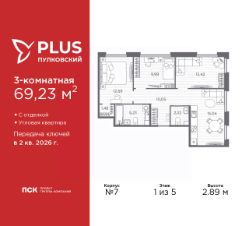 3-комн. квартира с отделкой в ЖК "PLUS Пулковский" на 1 этаже. Общая площадь: 69.23 кв.м., жилая: 35.1 кв.м., площадь просторной кухни-столовой: 15.04 кв.м. Угловая квартира, очень светлая, естественная вентиляция при открытии окон. В квартире один совмещенный и один раздельный санузел. Высота потолков 2.89 м.