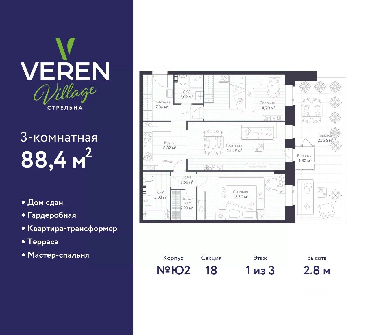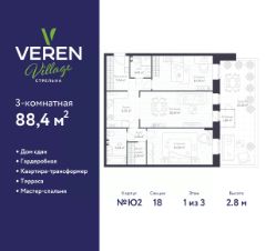 Просторная двухкомнатная квартира в ЖК "VEREN VILLAGE Стрельна" на 1 этаже. Квартира без отделки, полностью готова к ремонту. Общая площадь: 88.4 кв.м., жилая: 31.2 кв.м., площадь просторной куxни-гостиной: 26.71 кв.м. Комнаты изолированные, все окна выходят на одну сторону. В квартире один балкон, два совмещенных санузла. Наличие в квартире террасы дает возможность для обустройства дополнительной площади. Высота потолков 2.8 м.