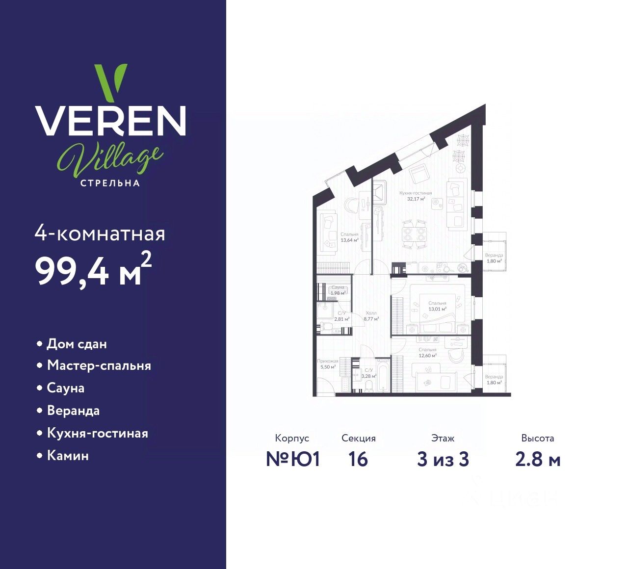 Продается 3-комн. квартира от застройщика в ЖК "VEREN VILLAGE Стрельна" на 3 этаже. Квартира без отделки, после получения ключей можно делать ремонт. Общая площадь: 99.4 кв.м., жилая: 39.25 кв.м., площадь просторной куxни-гостиной: 32.17 кв.м. Угловая квартира, идеально подойдет любителям тишины и панорамных видов. В квартире два балкона, два совмещенных санузла. Высота потолков 2.8 м.