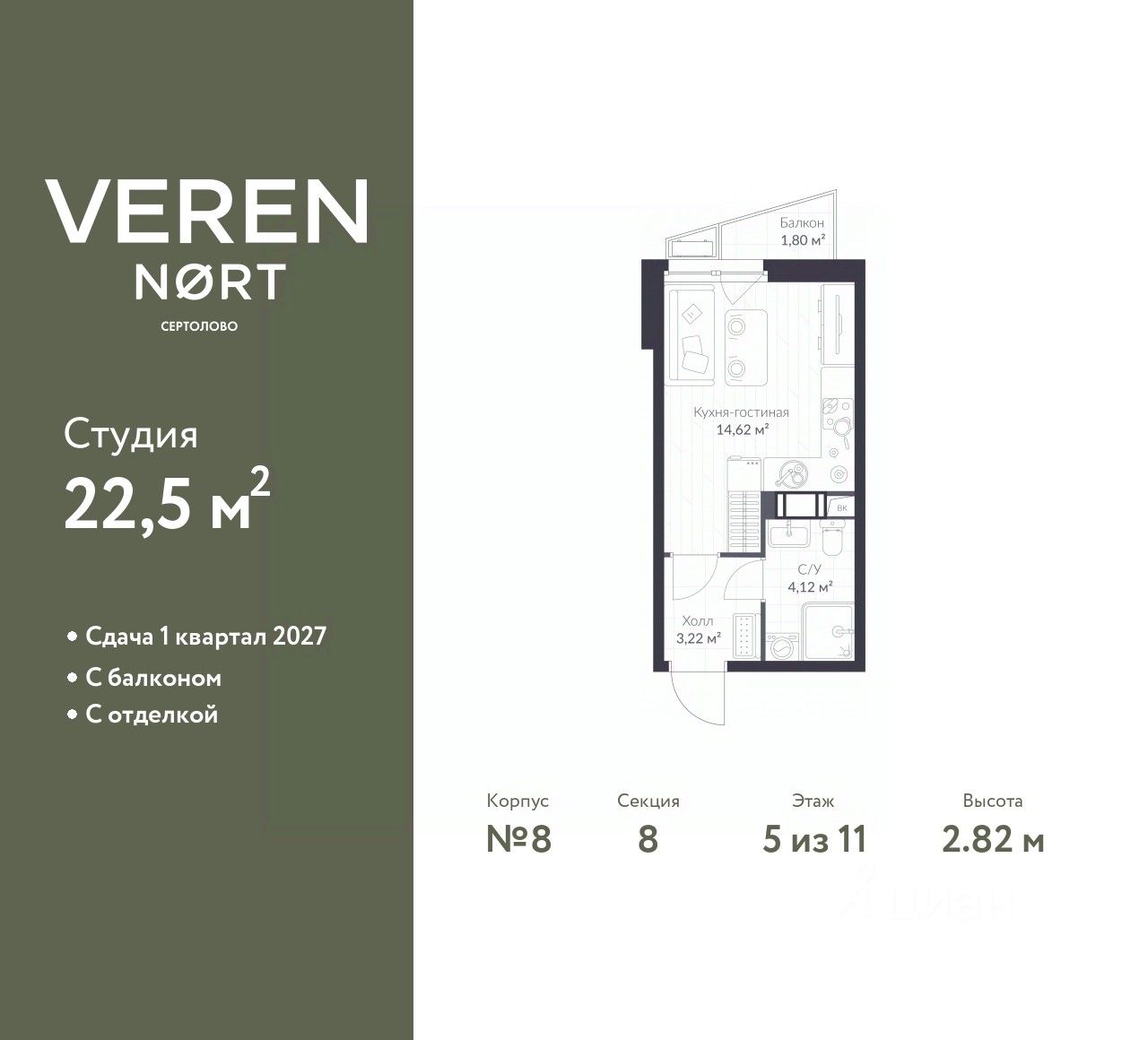 Однокомнатная квартира-студия с предчистовой отделкой в Veren Nort Сертолово на 5 этаже. Общая площадь: 22.5 кв.м., площадь гостиной 14.62 кв.м., из которых 5 кв.м. выделено под кухонную зону. Все окна выходят на одну сторону. В квартире один балкон, один совмещенный санузел. Высота потолков 2.82 м.